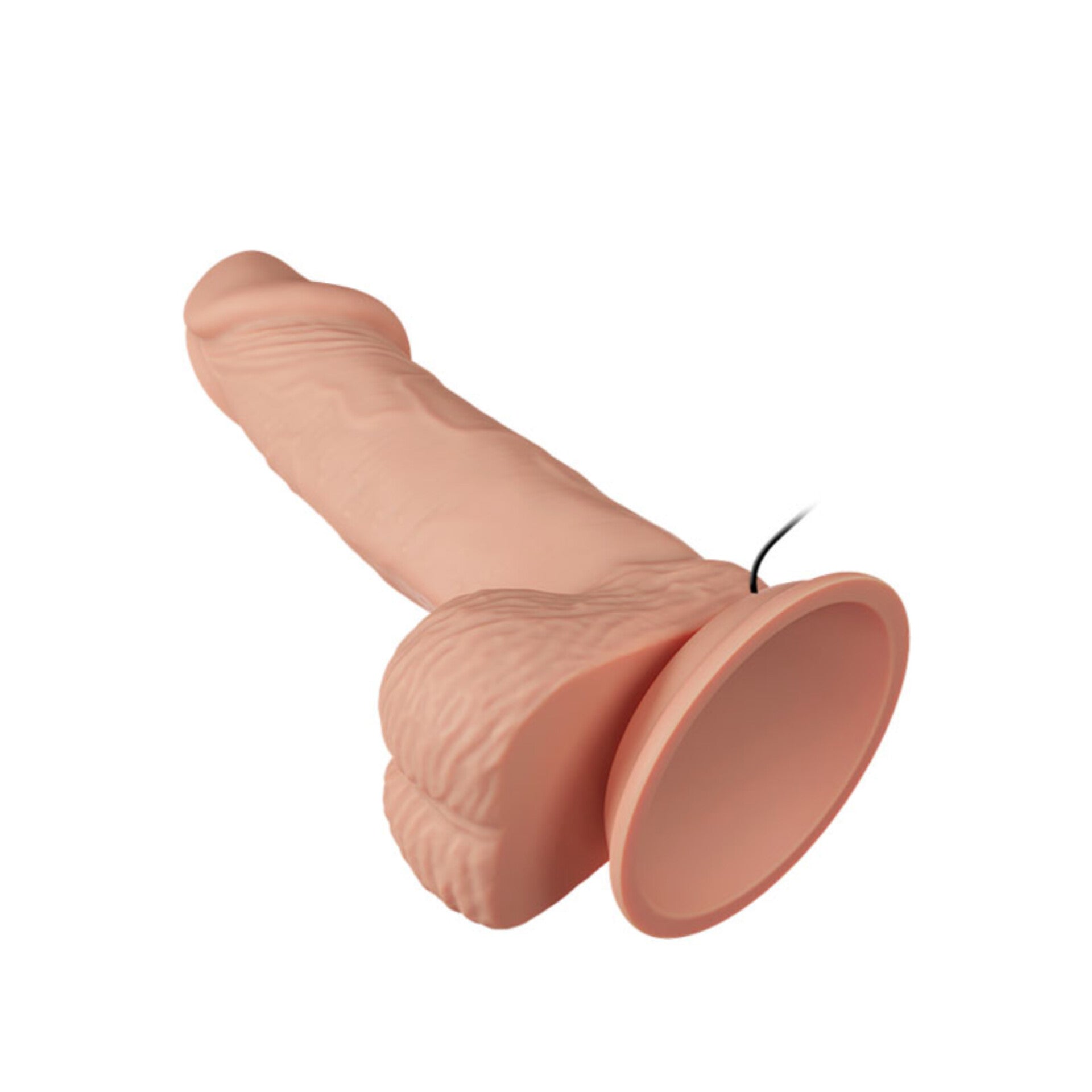 Pênis realístico 19,4 cm com vibração multivelocidade. Possui dupla densidade, interior firme e pele exterior suave e maleável, veias salientes, escroto e ventosa.